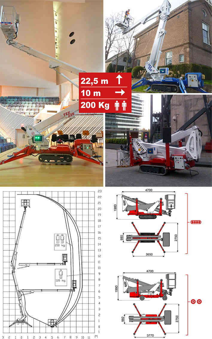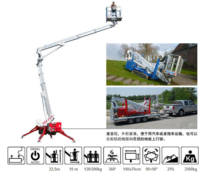 TZX225曲臂蜘蛛式升降車是蜘蛛車中重量較輕的伸縮臂升降平臺,臂架采用鋁合金臂架。其特點是自重較輕,可運用在大廈、商場、酒店等不能承受過重升降設備的場所。運用四條支腿為支撐點,支撐整個設備在升降中的平衡,體形小巧,可通過正常門框,動力為交流電、電瓶或燃油。TZX225曲臂蜘蛛式升降車底盤可以配置履帶式和輪胎式兩種行走形式的底盤。